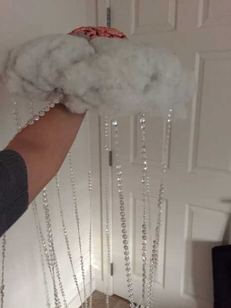 Si encuentras un cerebro diferente, esto se puede unir más hacia la parte delantera del sombrero. En lugar de granos, perno cortado lluvia cae en la camisa. Diadema con el cerebro más pequeño, las nubes y un rayo