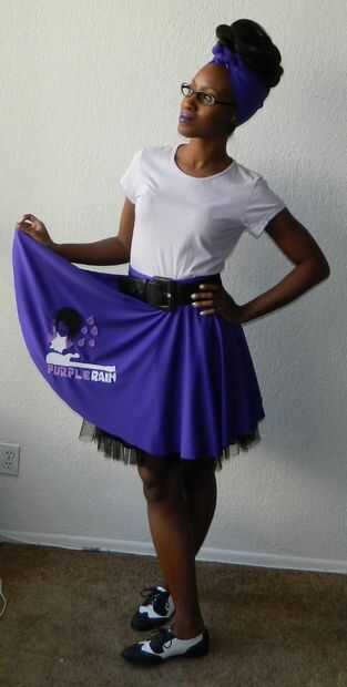 Yo sabía que tenía que volver a crear esta falda para mí y que de exactamente lo que hizo! Esta falda era bastante rápida y sencilla, todo lo que tenía que hacer era cortar una falda de círculo, coloque una pretina y colocar una banda elástica. Los apliques de la falda encontré el cartel de la película Purple Rain en línea, amplía la foto, añadir algunas gotas de lluvia púrpura y borrar el fondo. Una vez que estaba satisfecho con el diseño imprime, recorta las formas y trazado sobre el fieltro. A partir de ahí os adjunto las piezas a la falda con cola y terminé!