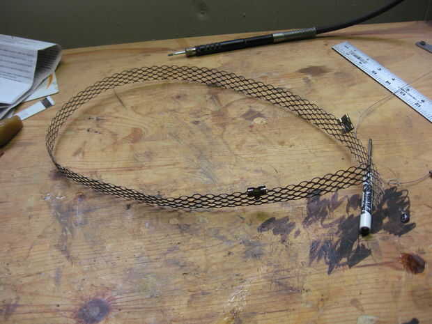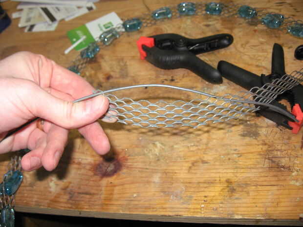Con eso hecho tomar su pesado cable calibre y enrósquelo dentro y fuera de la red a lo largo de un borde de la rejilla. Se dará cuenta de que la red ya tiene algunos granos pegados a él en la foto. Esto es porque comencé a pegar los granos a la red y cuando lo he hecho, descubrí la que manera la red no era lo suficientemente fuerte como para soportar el peso de los granos. Así que he añadido el cable de grueso calibre. Haz tu vida simple y añadir el cable antes de pegar en los granos. Asegúrese de dejar una cola de alambre.