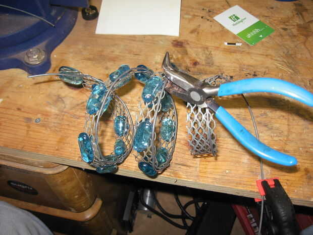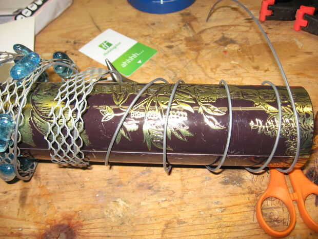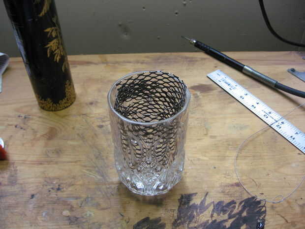 Con el cable en su lugar forma la red envolviendo alrededor de un recipiente de diámetro largo, asegúrese de envolver la cola de alambre alrededor del contenedor así. La cola se inserta en el envase de cristal para apoyar la red. Para obtener la espiral de la herida muy ajustada puede rellenar en el recipiente de vidrio. Si el alambre todavía sobresale demasiado de la red utilice un par de pinzas para prensar el cable cerca de la red.