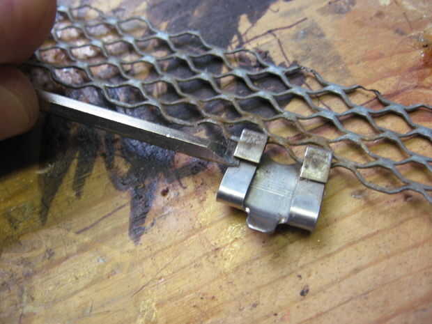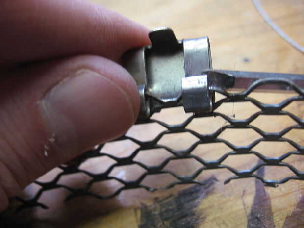 Ahora pasamos a la rejilla que soporta la lluvia cae. El primer paso en la preparación de la red es para quitar los clips que habría sostenido la rejilla a la canaleta... Si yo no hubiera cortado fuera de la red original. Para quitar los clips me inserta un destornillador de cabeza plana en el clip y puedan abrirla.
