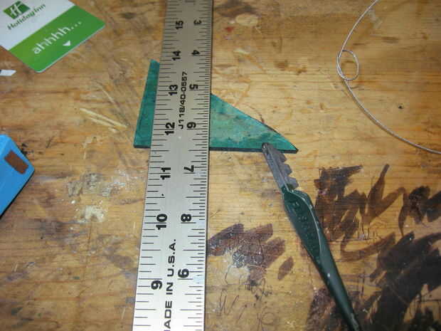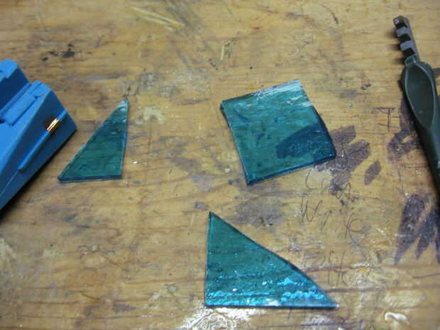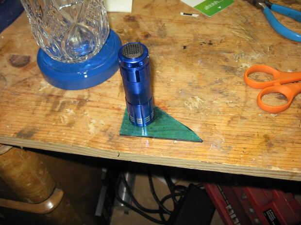 Ahora tendremos que modificar la linterna. Quiero ocultar la linterna así como pueda para no distraer de la pieza. Solo quiero la luz que se notará y no la fuente. Así que primero cambié una linterna roja a una azul. Para cubrir la luz recorta un pedazo de vidrio por anotar con una glasscutter guiada por una regla y luego con unos alicates de última hora para ajustar las líneas de puntuación. Con eso logra manchada algunas E-6000 alrededor de la circunferencia de la linterna y entonces presiona a del vidrio. Luego tenía que ser paciente y deje que se seque. El tiempo de secado me dio para empezar el siguiente paso.