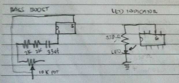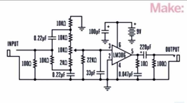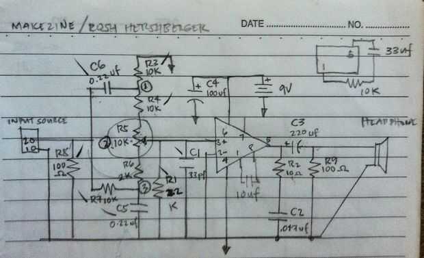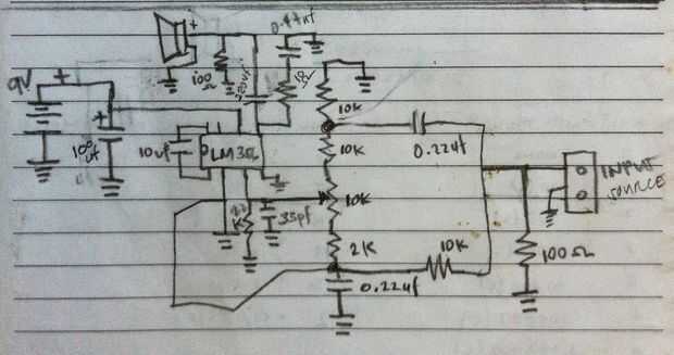 Varios esquemas del LM386 amplificador de audio, Guitarra están disponibles en muchos sitios., también podría encontrar muchos descenso LM386 ibles aquí. Aquí está el esquema encontrado en Makezine por Rosh Hershberger., entonces esquemas dibujados manualmente en nota y alterado y añade algunos componentes para eliminar la distorsión., solo para clarificar las cosas para arriba, soy no diciendo que los esquemas de Rosh no es perfecto., acaba de agregar algunos componentes que me funciona.