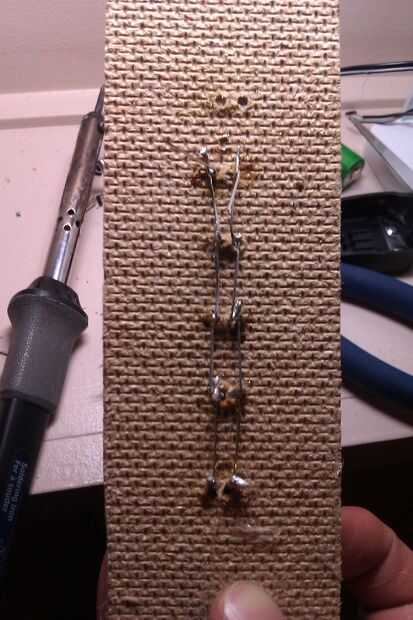 Para hacer una franja de luz simple, necesitas dos tableros de madera finos con dos filas de seis agujeros pequeños para poner los cables del LED a través de. Luego coloque el extremo positivo en una fila. Hice un error de no hacerlo y tuvo que volver dos veces la Junta. Básicamente, se trata de 6 LEDs en paralelo. También necesitas los cables en el circuito