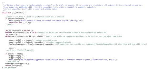 Por último, si el "if(count == 1000)" no se cumple condición, entonces el tiempo lazo fue detenido porque se generó una propuesta válida. getRandom llama al método markSuggested para marcar en la matriz "vista" que este episodio particular ya se ha sugerido y devuelve la sugerencia para la exhibición.