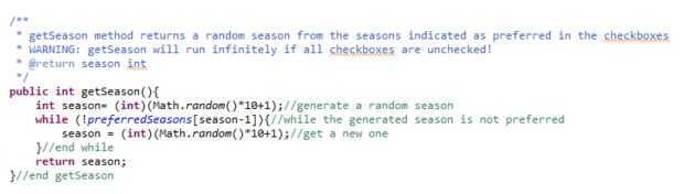 En primer lugar, escoge un número aleatorio entre 1 y 10 (ambos inclusive). Entonces, si la posición en "preferredSeasons" correspondiente a ese número de estación es falso (que significa que no está marcada la casilla de verificación de la temporada), una nueva temporada al azar genera. getSeason se repite este patrón hasta que se genera un número de temporada que corresponde a un "verdadero" en "preferredSeasons" (una caja marcada temporada). Esta temporada se volvió.