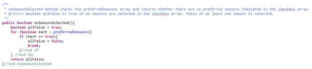 La variable booleana "allFalse" es declarada y establecida en true. Luego, utilizando una para: cada bucle a través de "preferredSeasons", noSeasonSelected, comprueba si ninguna posición en "preferredSeasons" es verdadera. Si encuentra una posición que es cierto, "allFalse" se establece en false y devuelve.