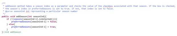 Esencialmente, el método de addSeason actualiza posición de una estación dada de la matriz "preferredSeasons" que corresponden con el estado comprobado / de su casilla de verificación. Una temporada se pasa como parámetro, y addSeason primero comprueba si está activada la casilla de verificación asociada a esa temporada. Si no es así, "preferredSeasons" en el índice asociado a esta temporada se establece en false. De lo contrario, esa posición se establece en true.