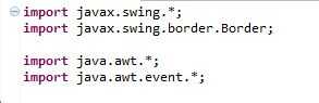 La mayoría de los componentes GUI (interfaz gráfica de usuario) necesitamos provienen de javax.swing, y el control de botones y casillas de verificación de eventos viene de java.awt.event. Ambos están disponibles automáticamente al iniciar un nuevo proyecto en Eclipse.