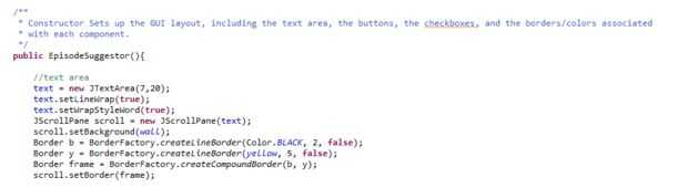 Esta sección inicia el constructor de la clase EpisodeSuggestor que, como sugiere el comentario de JavaDoc, pondrá en marcha el área de texto, botones y casillas de verificación de la pantalla.