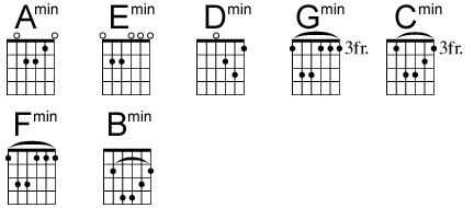Acordes de menor importancia, son acordes sólo regulares, como las que aprendiste solo. El nombre de estos acordes son un menor de edad, B menor, do menor, el menor de D, E menor, menor de F, y G menor. Los diagramas de acordes están por encima. Algunos acordes pueden ser difíciles porque hay que cubrir todo con los dedos un traste. Son los llamados acordes de cejilla. En tanto práctica, será fácil tocar estos acordes.
