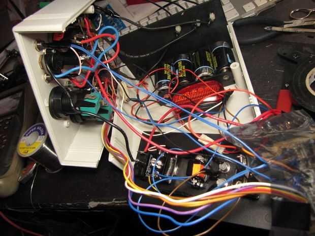Como ves, el cableado es un total desastre. ¿Por qué? Esto es porque no era plan lo bien y empezar a soldar alambre uno tras otro. Por casualidad no es tan importante en este proyecto. He intentado varias veces para cerrar el cuadro de para finalmente llegar a él. Pero la próxima vez que voy a tener que cambiar las pilas voy a llegar a este proceso otra vez. Así que si las pilas alcalinas no duró mucho, previsto reemplazar unas recargables y añadir un conector a la caja para recargarlas.
