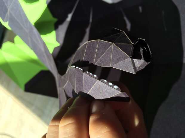 1. imagine pegando para arriba antes de hacerlo. Esto puede ahorrar algo de dolor, a menudo es más fácil de construir el modelo de una forma que otro. Para estos objetos escalas a veces es mejor comenzar en el extremo pequeño. En este caso pegado algunas unidades grandes de la parte negra, luego, al darse cuenta que debería comenzar con las piezas pequeñas, conectado a las unidades pequeñas. En realidad pegué el primer 15 unidades pequeñas a-borde. El grosor del papel es suficiente para mantener un poquito de pegamento. Corté de las aletas con unas tijeras según sea necesario.