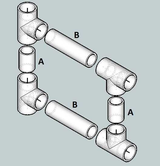 La longitud de la tubería A es apenas suficientemente grande como para pegar los dos T para que toquen entre sí.