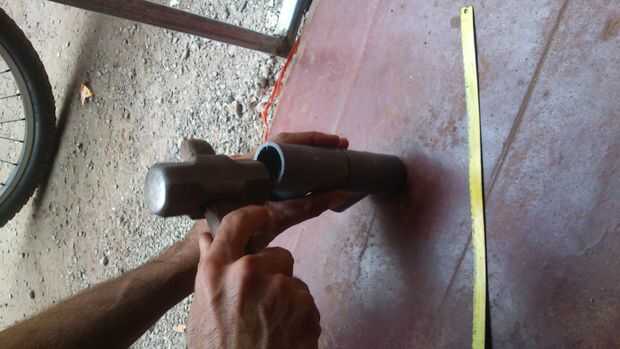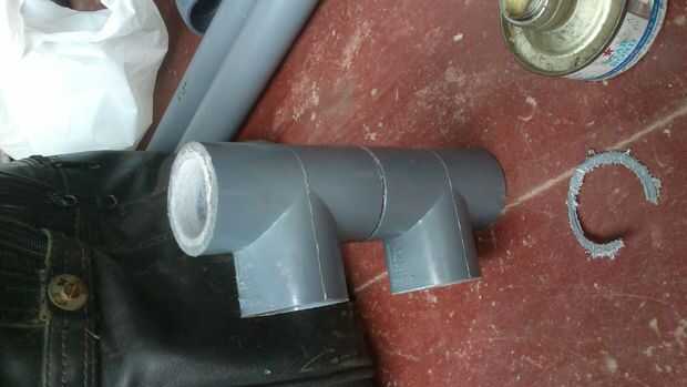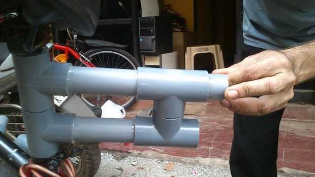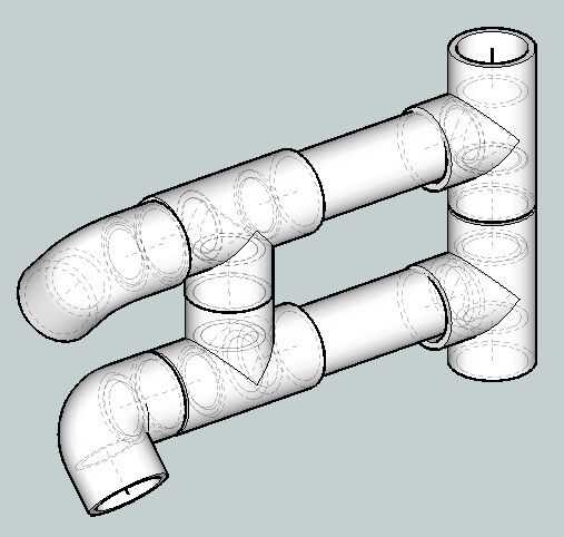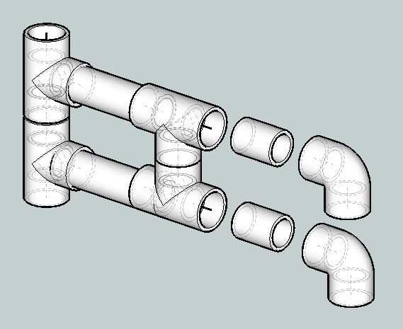 Al final de esto se pegan dos curvas de 90 grados semejantemente con tubo A. Las curvas están alineadas aproximadamente 45 grados a ambos lados de la vertical.