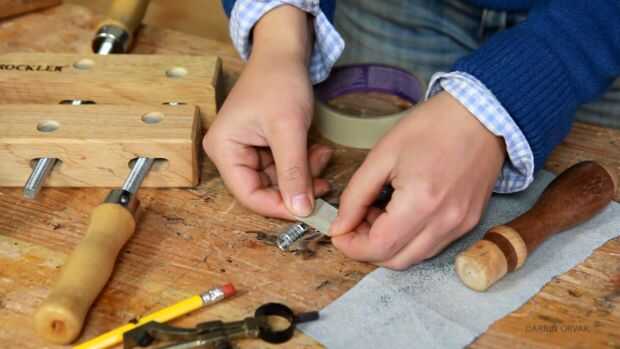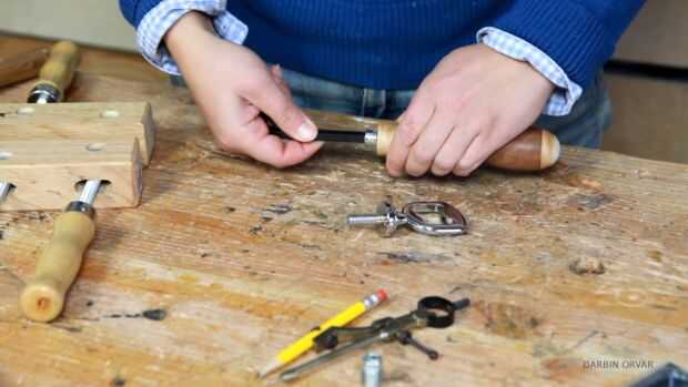 Una vez que todos los identificadores de vuelta, usé una brújula para encontrar el centro. Aquí estoy marcando la profundidad de este inserto roscado que pretende atornillar dentro del mango, por lo que la herramienta se puede unir a él. Introduzca hasta perforar los agujeros en las asas y luego enroscar la rosca.