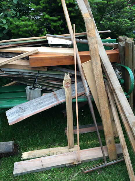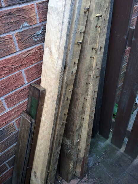Hace aproximadamente un año, me dieron varias paletas industriales de la fuerza de 2x6s. Después de renunciar a tratar de separar las secciones largas, usé una sierra circular para cortar lo que considero el material utilizable. Me quedé con cuarenta