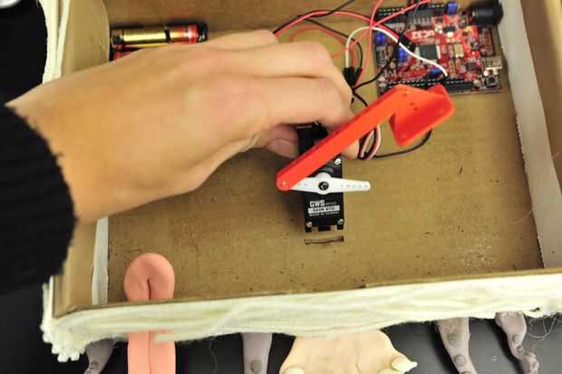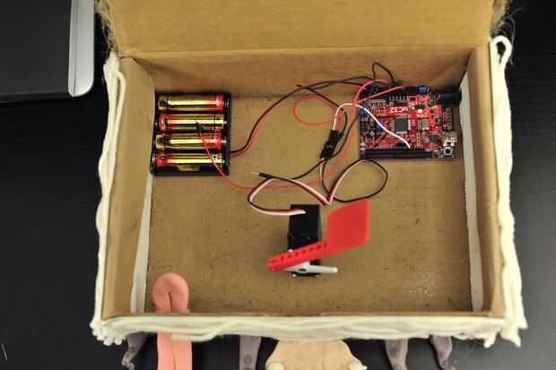 Antes de fijar el servo con ataduras de cremallera, necesita organizar su caja y decidir donde se colocará el servo. Colocamos las pilas en la parte posterior izquierda y el chipKIT uC32 en la parte posterior derecha de nuestra caja. Esto crea más espacio para el servo mover al poder fue conectado.