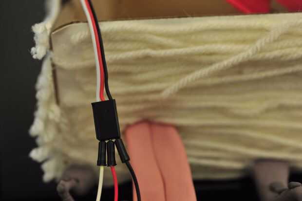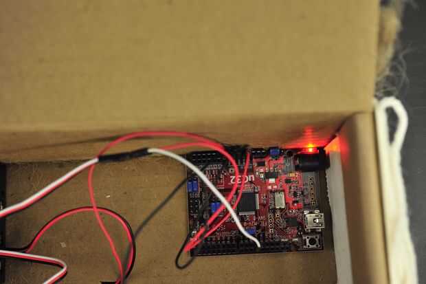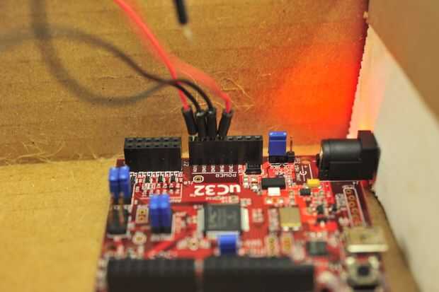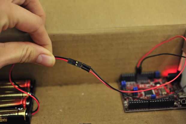 Antes de colocar el servo con ataduras de cremallera, tienes que probar el movimiento conectando todos los cables. Comenzamos conectando uno rojo y un cable protoboard negro frente a la batería roja y negra paquete de cables (ver imagen 1). El cable rojo se conecta al nuestro uC32 chipKIT para la clavija de entrada de voltaje (VIN) y el cable negro conectado a la GND pin (ver figura 2). Con estas conectado, tu uC32 chipKIT se encenderá una luz roja para indicar que la Junta está recibiendo energía. Puedes hacer otro agujero en la parte inferior de la caja ahora, similar a como lo hicimos en el paso 5: preparar el Servo. Corte un agujero para la conexión de la batería le permitirá convertir su caja y sin dañar su proyecto cuando el servo está conectado completamente y mover. Después de cortar el otro agujero, puede insertar los cables de protoboard conectados a la batería a través del orificio.