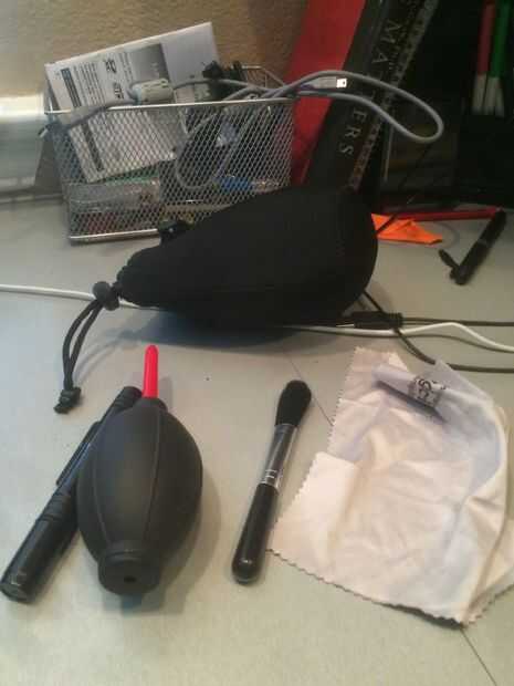 tengo mi equipo de limpieza en una bolsa pequeña lente. Tiene un ventilador 2 los cepillos y una microfibra paño de limpieza
