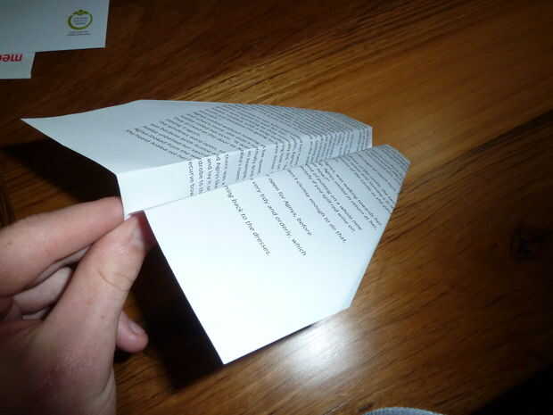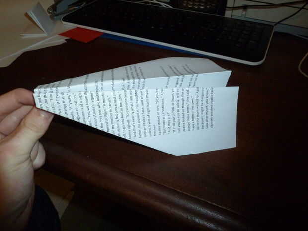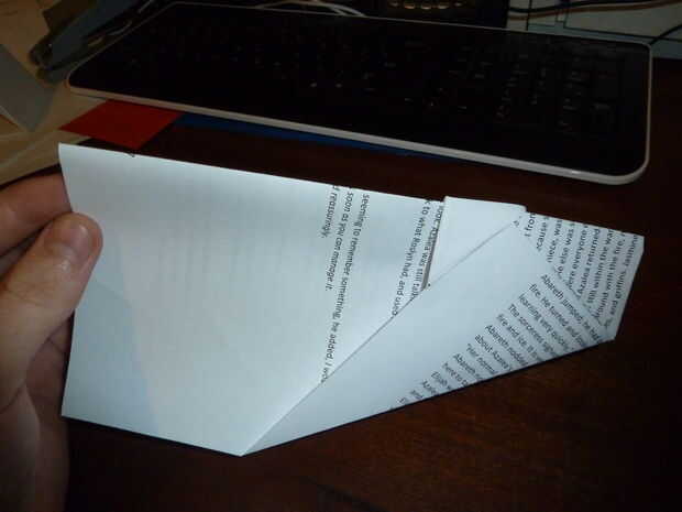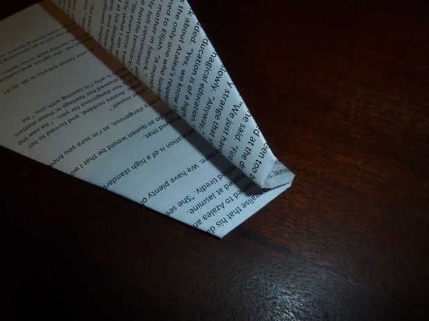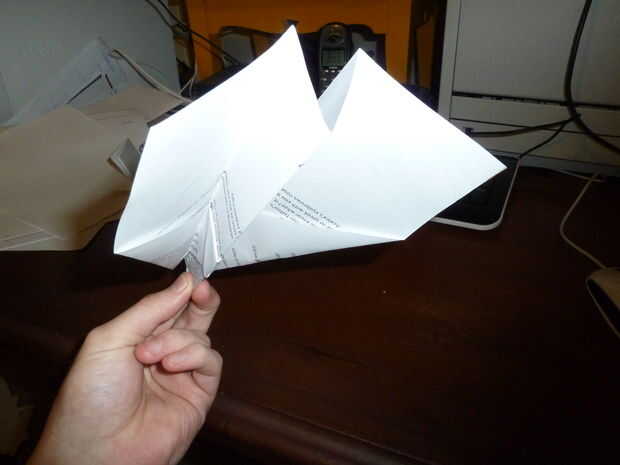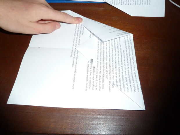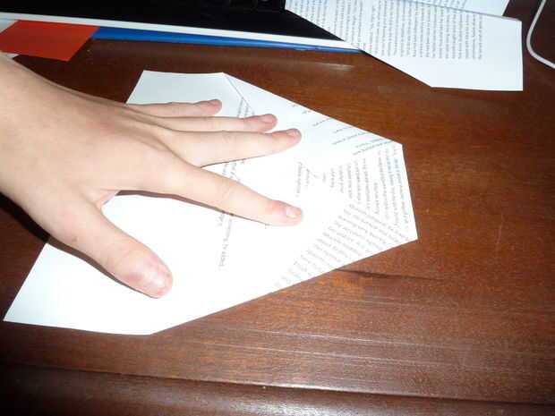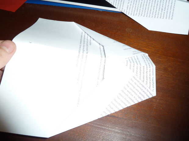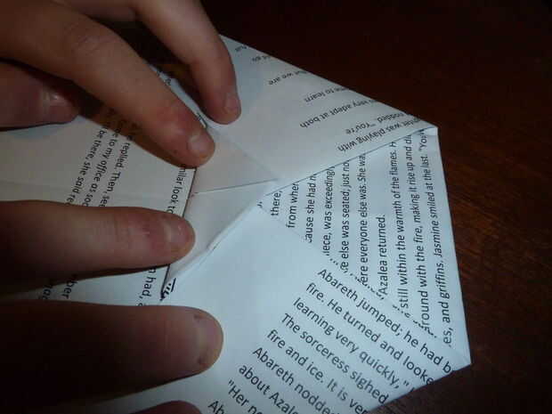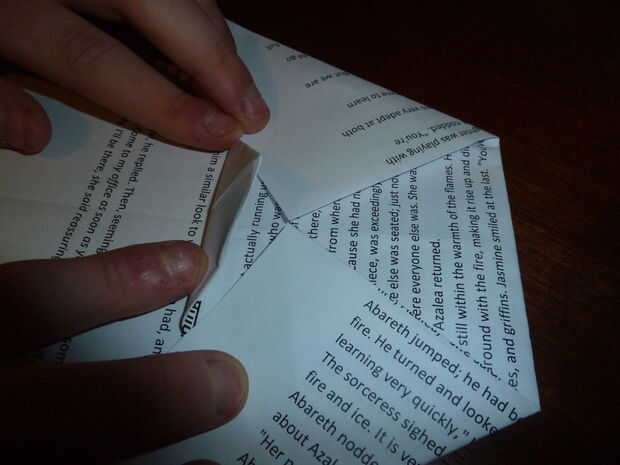 ahora doblar lo que se han convertido en el (en las fotos) superior e inferior izquierda esquinas en el centro aproximadamente una pulgada lejos del punto en el centro
