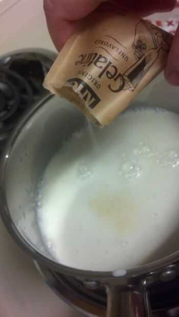 En la ollita, vierta 1 taza de leche fría y espolvorear en el paquete (1 oz) de gelatina. Batir ligeramente para combinar y luego los dejo reposar unos 3 minutos para permitir que la gelatina a la floración.
