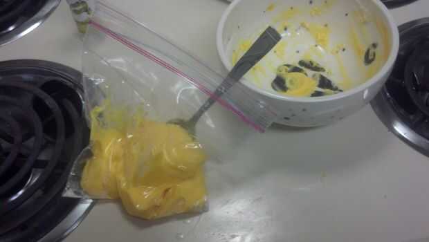 Usando la cuchara remueve la guinda con - pala que mezcla la 'yema' en la bolsa de ziplock sandwich. Presione tanto aire como sea posible de la bolsa y séllela cerrado.