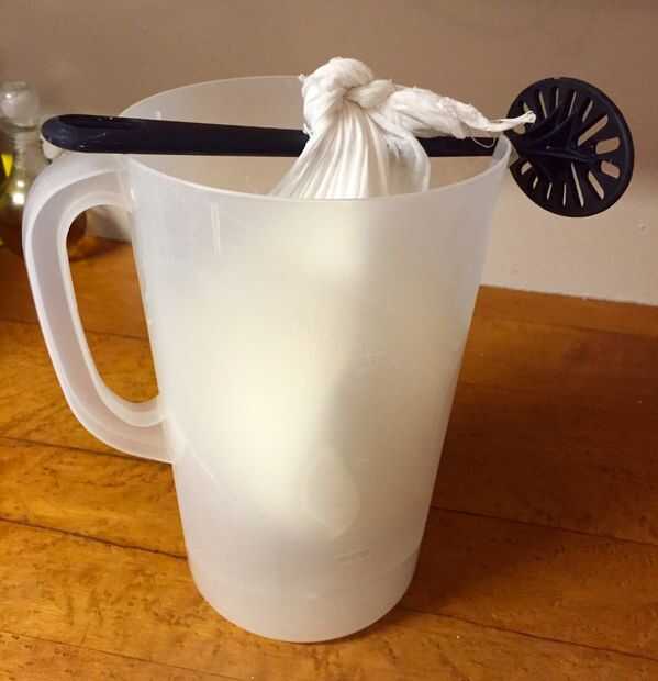 Poner el paño de queso en el colador. Luego verter el contenido de su envase de yogur sobre el paño. He utilizado un envase de 2 libras y tenía alrededor de 1 libra de "Quark" luego. Reunir a todos los lados de la tela y hacer un nudo. Ahora cualquier utensilio funciona mejor para usted a través del orificio en el nudo de la tela del queso y el yogur perder su exceso de líquido, que se captura la jarra. Después de aproximadamente 1 día debe tener "Quark". Realmente creo que 12 horas sería suficiente, porque he tenido que añadir algunos suero extra para hacerlo menos denso y más cremoso otra vez. Ahora, esto no es "verdadera" Quark, pero que va a hacer el trabajo y seguro que es menos intensivo de trabajo!