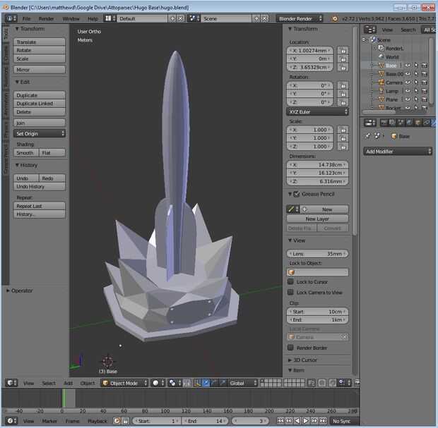 Incluí un modelo del cohete de Hugo en el diseño, por lo que pude juzgar mejor el efecto completo. Más tarde terminó consiguiendo una versión 3D impreso para ir con mi base de prototipo. Había basado el modelo de cohete de la hoja de especificaciones del oficial. Las aletas son un poco demasiado delgadas en comparación con lo real, pero las dimensiones son bastante buenas.