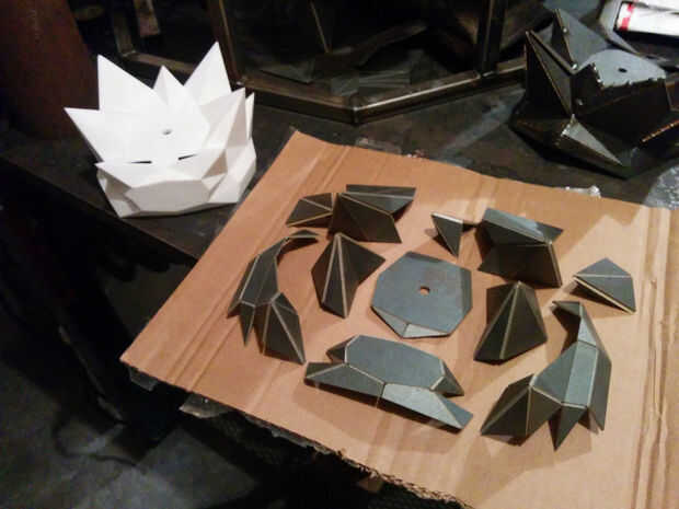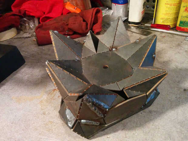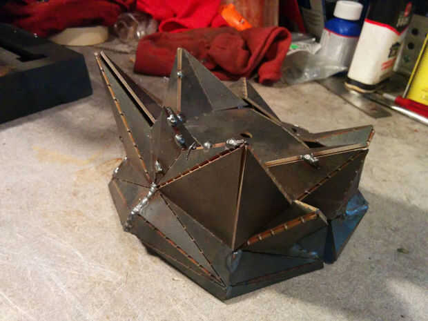 Las perforaciones trabajaban para doblar, pero eran super feos y bastante caro, como iniciar y detener el chorro de agua tanto agrega mucho tiempo a la corte. Pero peor aún, a diferencia de cuando se hizo en papel, las cosas no solo pop en forma. Todos los ángulos tuvieron que ser doblado exactamente antes de que irían juntos. Y aún entonces, los subconjuntos que se celebrará en exactamente la orientación adecuada para la soldadura. Se acumularía rápidamente los pequeños errores, dejando lagunas gigantes en la concha. Deprimido, volví a la mesa de dibujo.