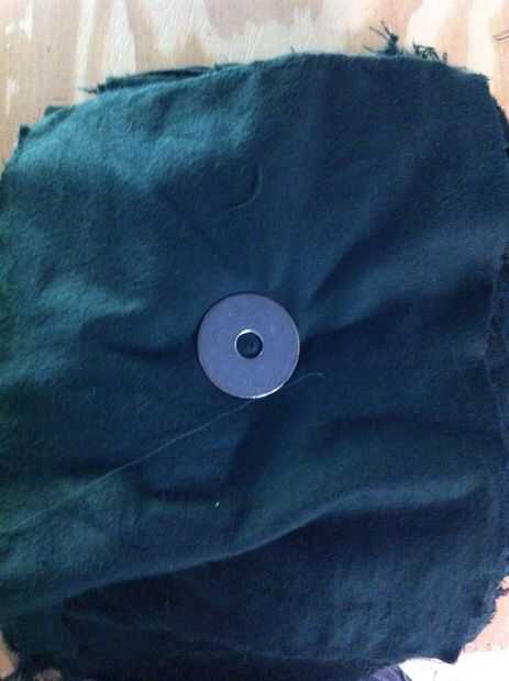 Una vez que tengas que hacer, es hora de montar. La Asamblea irá como este, deslice las arandelas, 1 pequeño y luego uno grande, en el tornillo, entonces forzar el tornillo a través de cada hoja de tela. Puede ayudar para escariar los orificios de la tela con un destornillador más grande primero. A continuación, atornille la cosa entera en el agujero que previamente ha perforado en el bloque residuos.