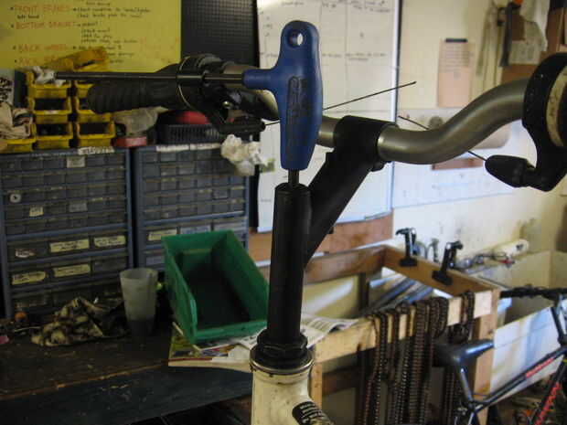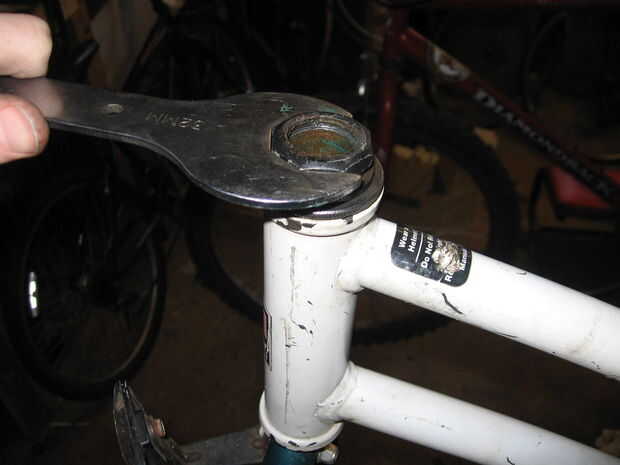 Si el marco tiene una horquilla, stem y manillar en ella comenzar ya, mediante la eliminación de estos. El tallo puede eliminarse primero aflojar el perno del auricular, que se encuentra en la parte superior del tallo, y luego aflojar el vástago cuña interior golpeando el tornillo aflojado con un instrumento despuntado. Tallos más modernos para roscado auriculares tienen un perno que necesita un 6mm llave allen para aflojarlos, pero algunos tallos más viejos pueden tener un tornillo que necesita una llave de 12mm regular (pero no me citan en ese tamaño).