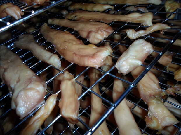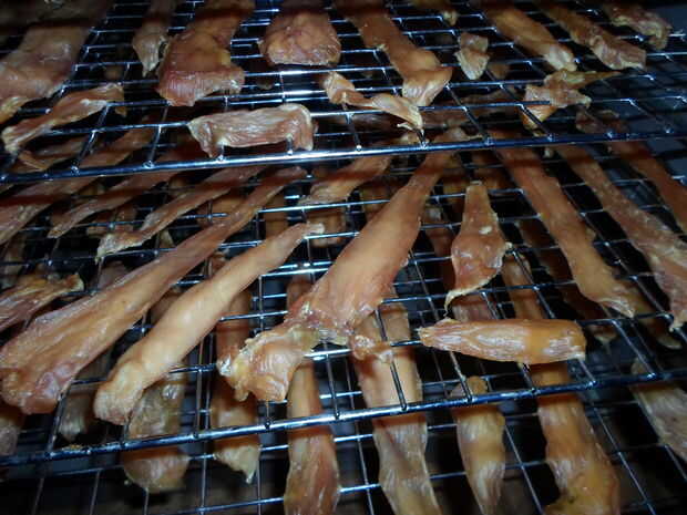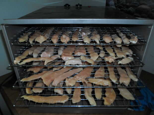 {Es importante tener en cuenta... no de los deshidratadores realizan lo mismo, tiempos de secado pueden variar grandemente entre los modelos. Lo importante es (con pollo) empezar a una temperatura alta, una vez que la carne se ve "cocidos" bajar el calor y una vez que se secan los bordes, dejar caer el calor otra vez.}
