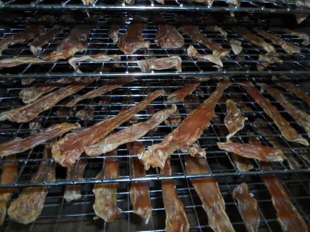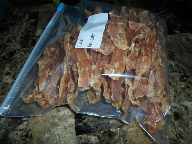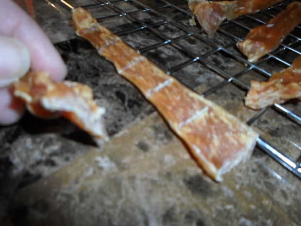 Las tiras de pollo se parecen... bueno, desigual! Siempre rompen un grueso en una pieza y compruebe que uniformemente se deseca.