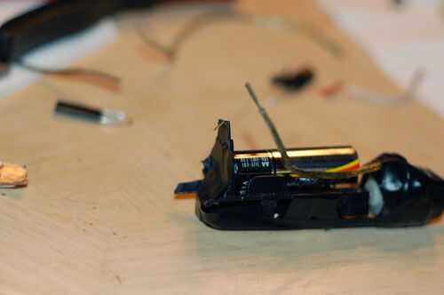 En primer lugar, usted necesita elegir un cable para estar conectado permanentemente, cinta adhesiva sobre una de las piezas de metal que están conectadas del contacto cbattery más cercana al motor. Si la batería del muelle fue agradable y expuesto como el mío, esto es fácil. Si no, acaba de encontrar un lugar que puede envolver alrededor de o con cinta adhesiva para que esté en contacto con uno de los contactos. Usted puede poner un poco de papel de aluminio frente el contacto y cinta adhesiva el cable que si tiene que.
