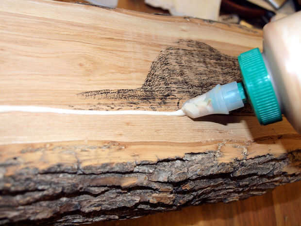 Una vez se haya enfriado que corrí una gota de pegamento de madera abajo de las grietas. Esto estabilice por lo que no deben conseguir más grandes. Dejar que el pegamento seque durante la noche y luego después lo recorte un poco, me lleno la grieta con masilla de madera. Necesitaba una buena superficie plana para escribir así que esto ayuda a lograr ese objetivo.