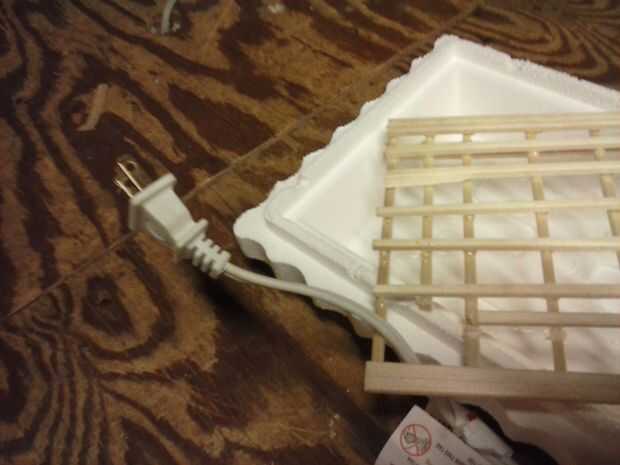 Lo bien, has hecho bastante en este punto. Conecte la luz de tres noche en el extremo del cable de extensión. Poner en la parte inferior de la nevera. El extremo del enchufe del cable de extensión deberá subir a través del stand. Así que cuando usted está haciendo su stand, deja un pequeño espacio abierto en la esquina de la misma, lo suficientemente grande como para la clavija del cable de extensión para recorrer. Echa un vistazo a la imagen.