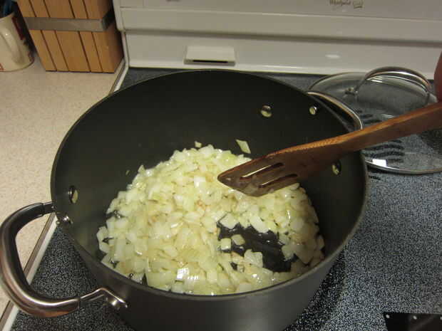 Picar la cebolla y el ajo. Calentar el aceite de oliva a fuego medio en una olla grande o un horno holandés y añadir la cebolla cuando el aceite comienza a shimmer. Revuelva y cocine a fuego medio hasta que estén tiernos, unos 10 minutos. Añadir el ajo y revuelva hasta que la fragancia, cuidado de no dejarlo quemar.