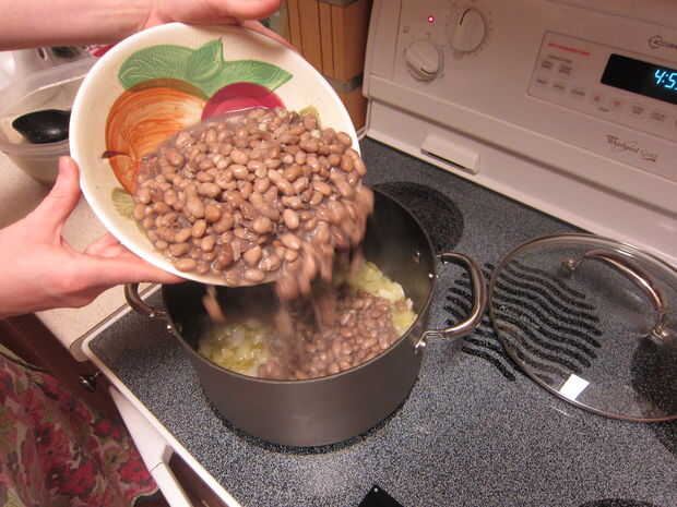 Vierta los frijoles sin escurrir y revolver bien. Hierva suavemente durante unos 10 minutos.