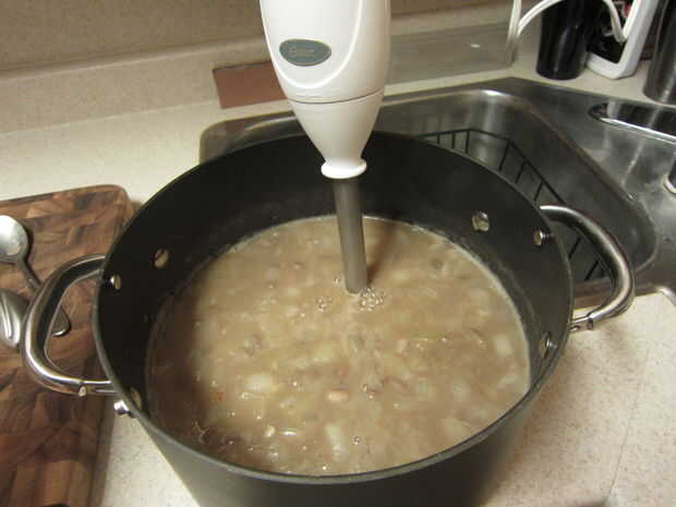 Ahora viene la diversión parte! Usando una licuadora (muy minuciosamente para salpicaduras de líquido caliente en sí mismo) o trituradora de la patata, puré de frijoles como incluso una consistencia como usted puede. La textura que buscas es como una sopa espesa, así que si usted lo necesita para espesar un poco, cocer a fuego lento destapado otro 10 minutos más o menos. Si son demasiado gruesos, añadir un poco más de líquido (ya sea de los granos si usted utiliza frijoles secos o un poco de caldo de pollo o agua si usaste las habas conservadas). También tenga en cuenta que la lobio espesará un poco que se enfríe.