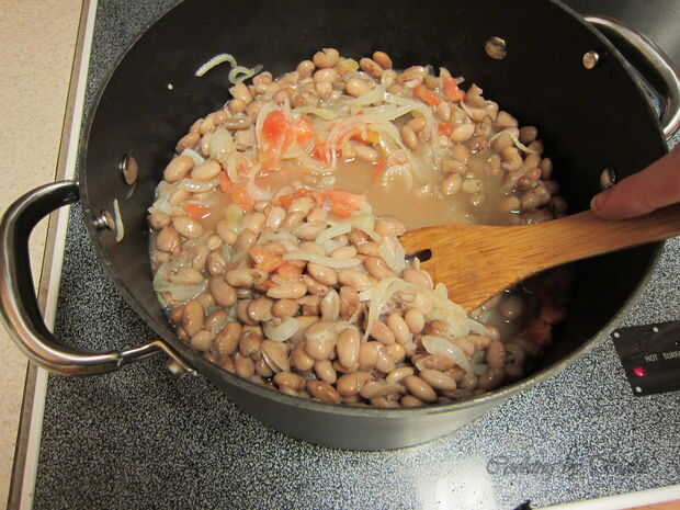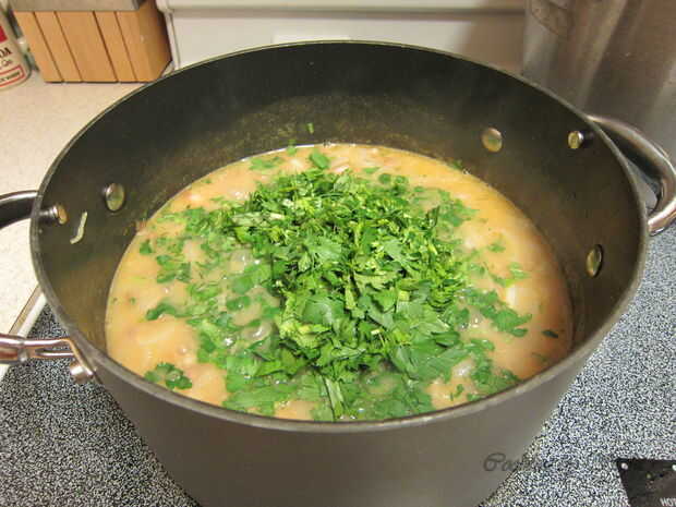 Añadir las hierbas a los frijoles y comprobar de sal y pimienta. Remover y servir.
