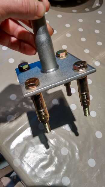 Estos permiten una instalación de galpón puestos sobre una superficie irregular o pendiente, así como proporcionar una separación de aguas superficiales que puedan eventualmente pudren los puestos, que es la última cosa que usted quiere, especialmente en un sitio expuesto como este. Incluso las resina de alerce eventualmente se pudre! Estos se fijan en el prelaid base de concreto con pernos de tacos de cabeza hexagonal de 12mm 4 por post apoyo. Hay 8 entradas en cobertizo en total - 4 largo (en la parte posterior del cobertizo) y 4 más corto (en frente) con tirantes entre para mantenerlo todo junto. Creo que para fijar los tacos en el hormigón es bastante autoexplicativo, pero si no sabes cómo o seguro entonces a google/youtube se que probablemente no vuelvo a las preguntas tan rápido como google ;-)