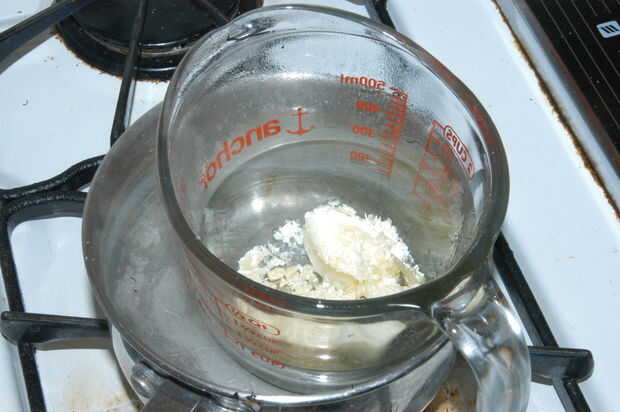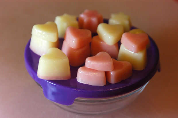 Tomar un bote pequeño y llenarlo de a mitad de camino con agua (puede que necesite vaciar algunos de él hacia fuera). Ponlo en la estufa y obtener el agua caliente y agradable - temperatura media debe estar bien. Luego, poner en el todos los ingredientes, excepto el aceite de vitamina E y ponerlo en un vaso de medir recipiente con una manija en él. Colocar en el agua (baño María) en la estufa. Vez y un tiempo, mezclar con una cuchara o un wisk. Seguir a mezclar hasta que quede un líquido puro. Luego retire del fuego y añadir las gotas de vitamina E y los aceites esenciales en este momento. Wisk todo y luego verter en la bandeja del cubo de hielo o de molde. Luego puede poner la bandeja en la nevera o el congelador y deje que se endurezca. No tarda mucho - entonces quitarlo y pop ellos. Puede que necesite usar un pequeño pincho o un cuchillo para empujar algunos de ellos fuera del molde.