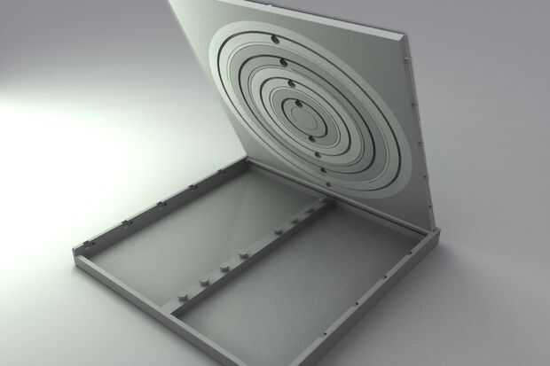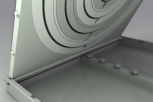 El principio de funcionamiento de este seguro es muy sencillo. Consiste en cuatro discos insertados en la tapa con un surco grabado en cada disco, estas ranuras mantengan ocho cabezas de los clavos a la costilla en el contenedor inferior. Estas uñas cabezas son liberadas cuando los discos están en cierta posición, así que puede tapa y envase mutuamente Deslice y suelte unos a otros.