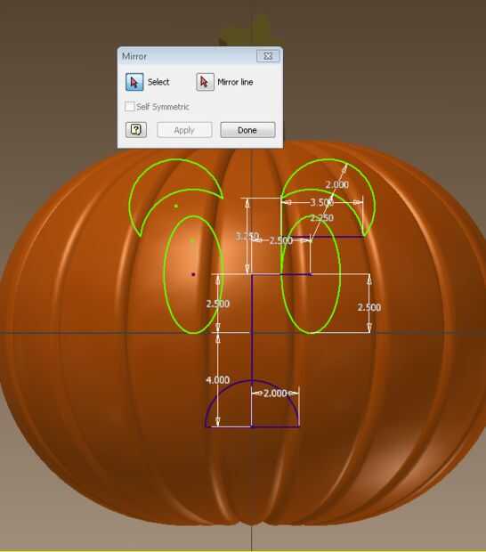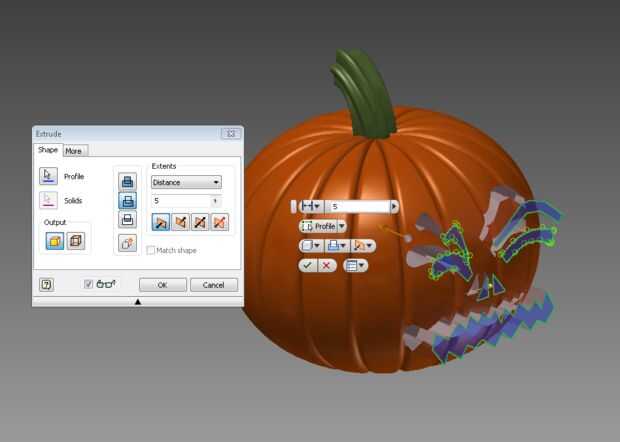 4) haga clic en el botón 'Extrude', seleccione el corte y todos los bocetos cerrados que componen el rostro, indica una distancia de extrusión de 6 y haga clic en aceptar