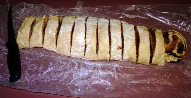 Cuando la masa esté rodillo hacia fuera y cubrir con la mezcla de 2T canela, C ¼ de azúcar morena, mantequilla ½ stick (doble de éstos) luego enrollo. (Cubrir con plástico para envolver - papel de cera se pega - y poner en el congelador durante 45 minutos).
