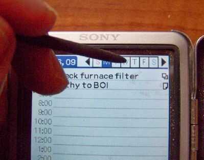Mi problema era que entradas de aguja a menudo no se registro, o la aguja tuvo que ser muy muy por encima de la zona objetivo para obtener la entrada deseada. Por lo tanto, para cambiar la pantalla de calendario diario del lunes (demostrado aquí) del miércoles, el lápiz tendría que estar casi fuera del marco de la pantalla, y luego probablemente no funcionaría. Necesito utilice el arriba/abajo botón de desplazamiento para avanzar a un nuevo día de la semana. Afortunadamente, hay una opción adicional para que la pantalla responda como se desee. A menudo terminaría en el día equivocado o la opción de menú equivocado.