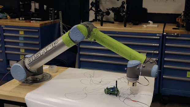 La cuestión principal pasa entonces de las máquinas a la interfaz entre ellos tanto en el software y el hardware. El brazo lleva un imán programable que le permite sujetar a y recoger el robot móvil de dibujo. Se utiliza un sistema de captura de movimiento en el espacio para ubicar la posición de la bot dibujo en tiempo real, permitiendo que las máquinas interactuar y colaborar.