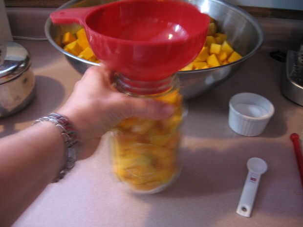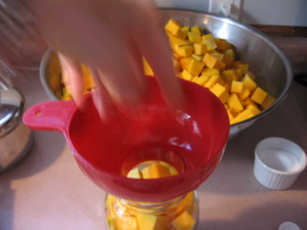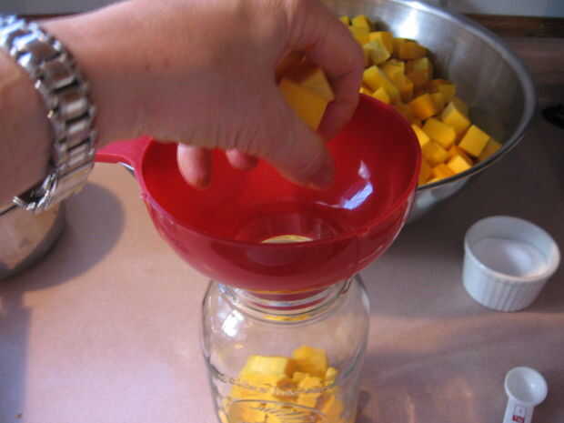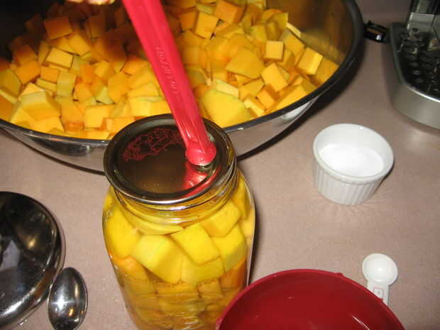 Método de empacado crudo es embalaje la calabaza en los tarros esterilizados calientes, dejando espacio para la cabeza 1 pulgada, luego llenar la jarra con agua hirviendo, sellado y procesado.