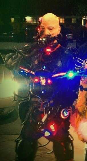 Una de mis características favoritas del traje es que ha construido en un funda de beber en el área de la entrepierna con una pajita que surge a través de la máscara, así que puedo disfrutar de un cóctel con manos libres! También hice una poco escotilla de puerta que le permite ir al baño en vez de sacar el traje entero! El centro de la "V" se hace de una de las naves de espacio de juguete de mi hijo. Añadí las luces y motor puertas. La garra fue hecha de un error Hex la araña, pero fue modificada al poder a través de USB en lugar de otro como todo lo demás en el traje.